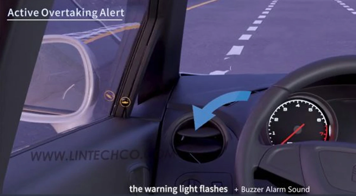 2nd level alarm: If the driver switches on the turn signal lamp while a car is in the detection area, the corresponding warning light flashes, and the buzzer sounds.